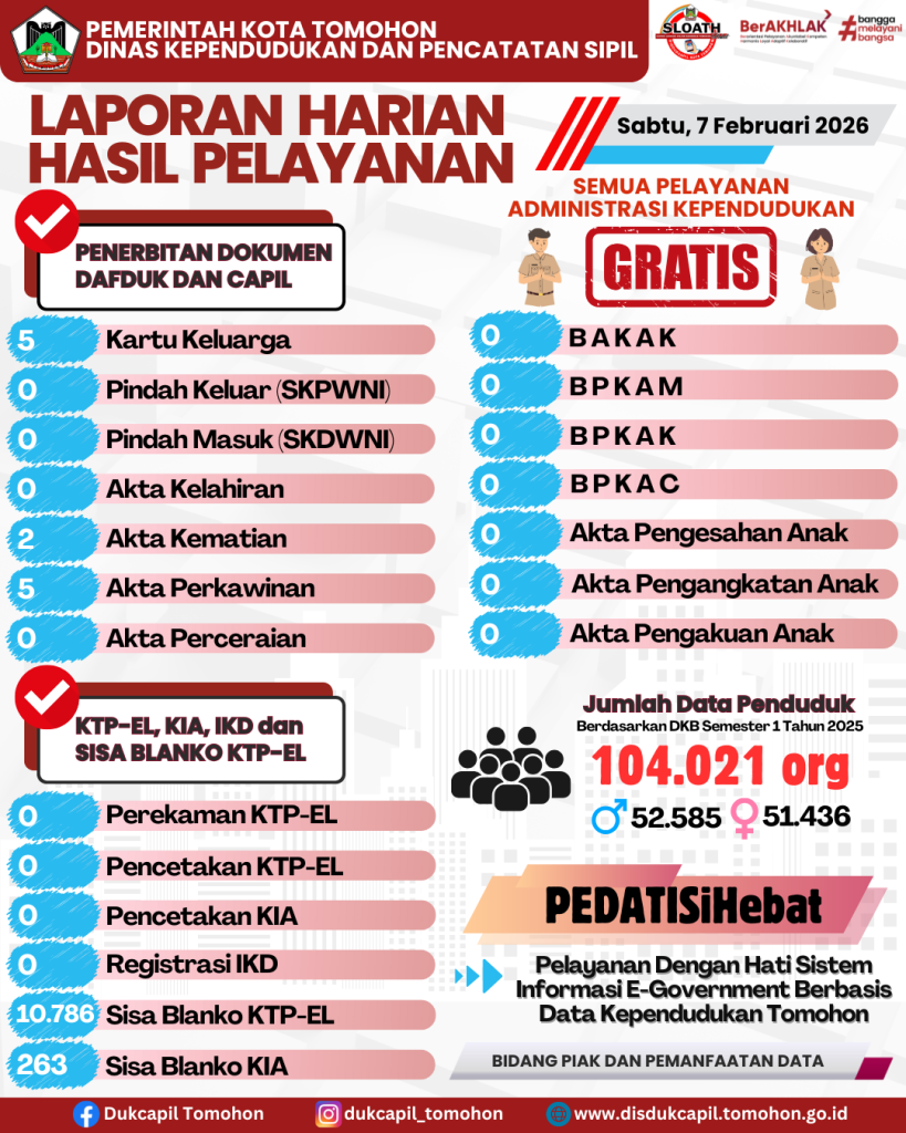 Berikut ini kami Informasikan Laporan Harian Hasil Pelayanan di Dinas Kependudukan dan Pencatatan Sipil Kota Tomohon.