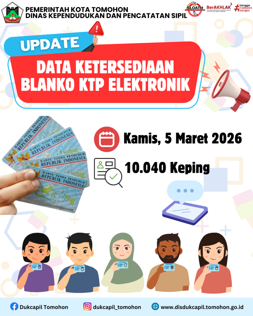 Berikut ini kami Informasikan Ketersediaan Blanko KTP-Elektronik di Dinas Kependudukan dan Pencatatan Sipil Kota Tomohon.