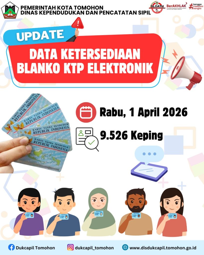 Berikut ini kami Informasikan Ketersediaan Blanko KTP-Elektronik di Dinas Kependudukan dan Pencatatan Sipil Kota Tomohon.