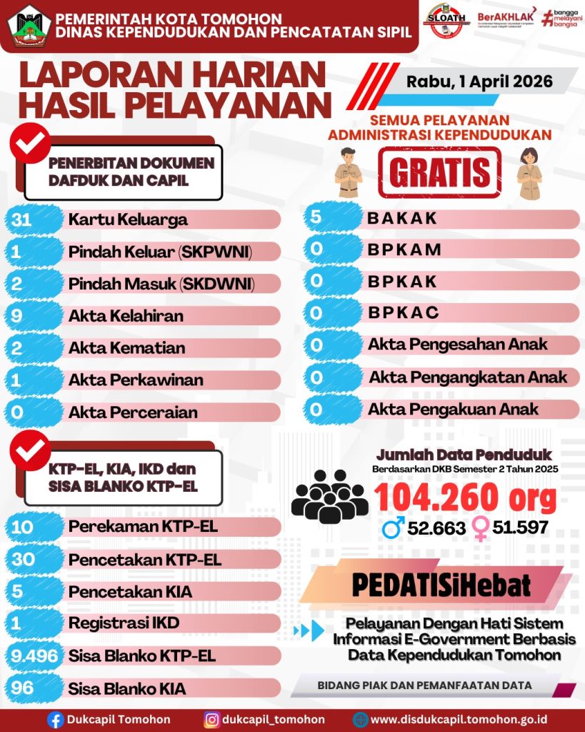 Berikut ini kami Informasikan Laporan Harian Hasil Pelayanan di Dinas Kependudukan dan Pencatatan Sipil Kota Tomohon.