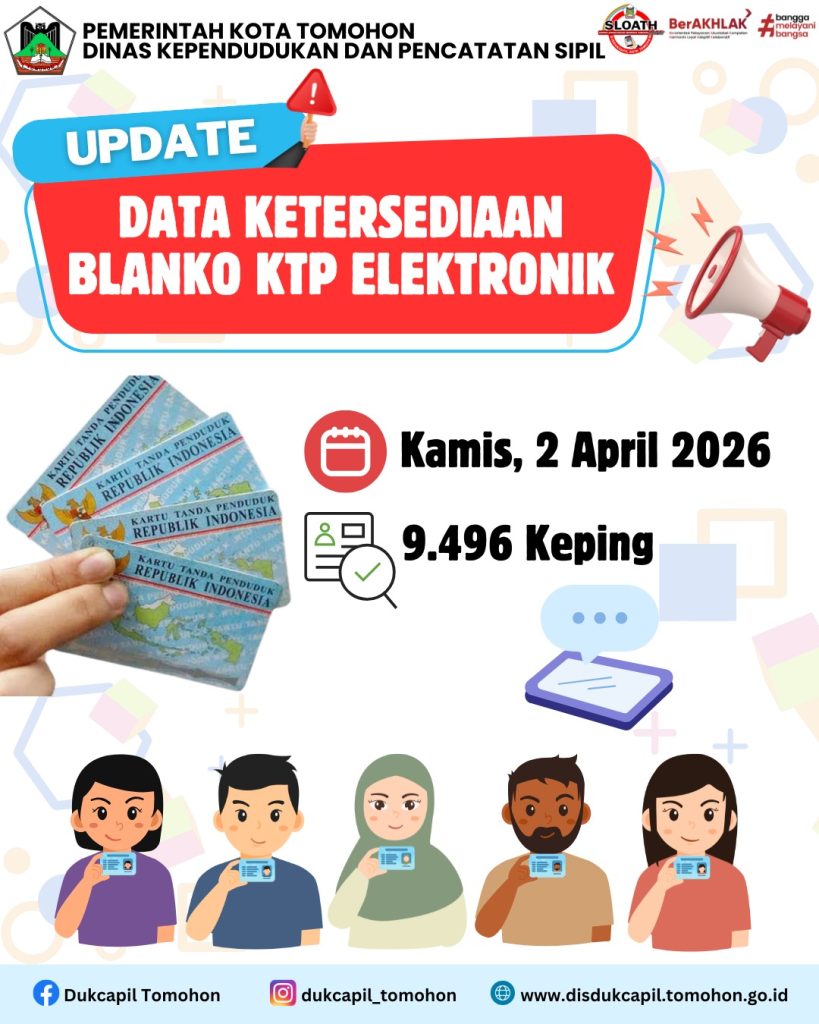 Berikut ini kami Informasikan Ketersediaan Blanko KTP-Elektronik di Dinas Kependudukan dan Pencatatan Sipil Kota Tomohon.